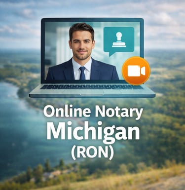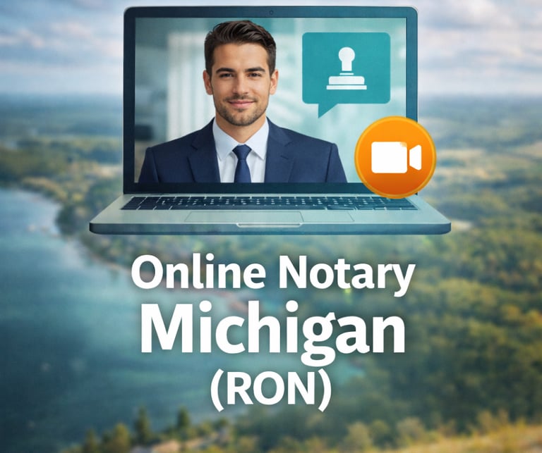 Get many Michigan documents notarized legally from your phone or computer in under 15 minutes. No travel, no waiting rooms, no bank hours — RON is statewide, 24 hours a day.